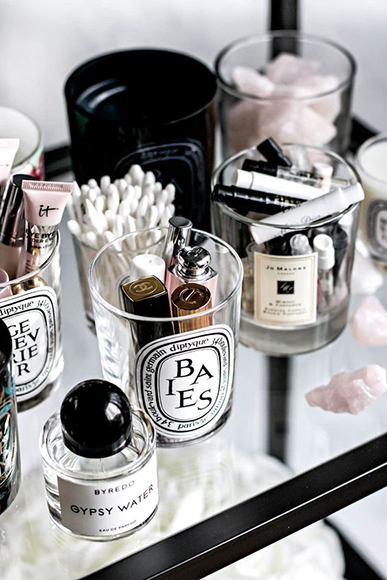 Выбирайте свечи в стеклянных подсвечниках. Cамые фотогеничные – у Jo Malone, Diptique, Zara Home. Когда свеча сгорит, подсвечник можно положить в посудомоечную машину, отмыть остатки воска и использовать для хранения ватных дисков и палочек, небольших кремов и бальзамов для губ, кистей для макияжа или канцелярских принадлежностей.