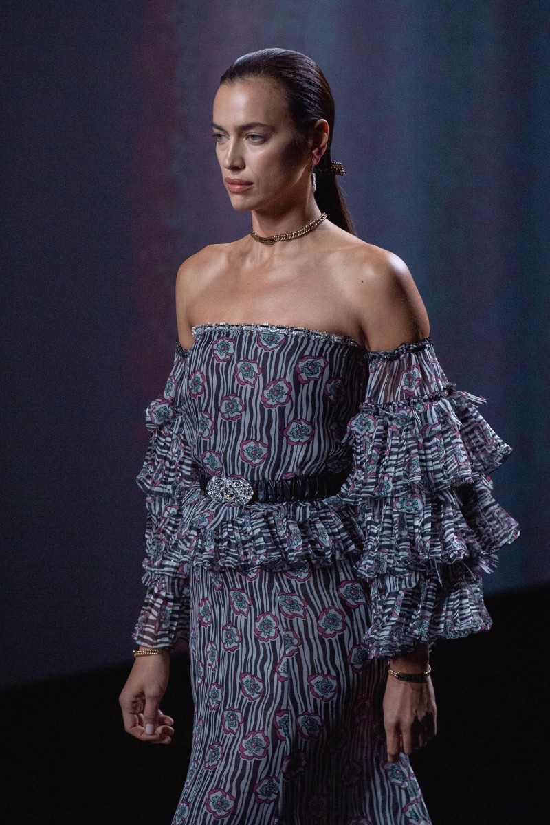 Второй важный момент шоу — Ирина Шейк. Супермодель впервые приняла участие в показе бренда, и это большой успех в ее карьере. На подиуме Ирина появилась  в костюме из шифона с оборками.
