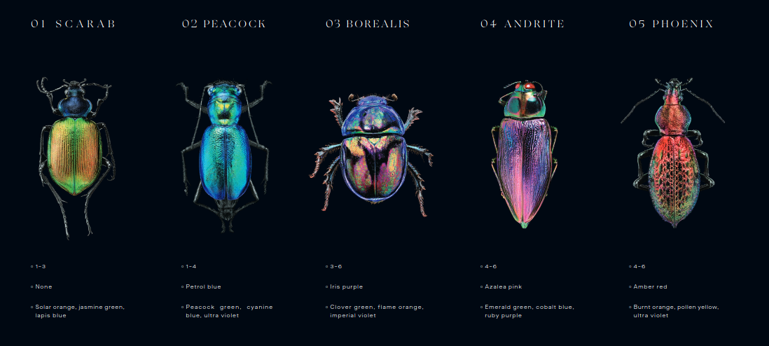 У Colour Alchemy пять цветов: «Скарабей», «Павлин», «Бореалис», «Андрит», «Феникс». У них есть переливы, похожие на бензиновые. И блондинкам, и брюнеткам, и рыжим подойдут абсолютно все варианты, можно экспериментировать. На темных волосах синяя краска может быть почти незаметна при обычном освещении и нейтральной температуре, но стоит выйти на улицу в жаркий полдень, как пряди станут изумрудными. А фиолетовый оттенок на светлых волосах во время зноя станет зеленым. Недостаточно и этого? Что ж, компания советует приобрести трафареты в виде цветка или бабочки. Тогда на волосах будут то появляться, то исчезать рисунки.