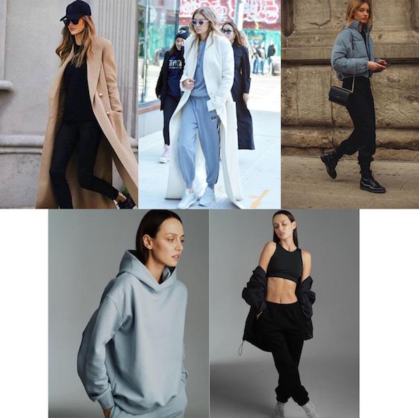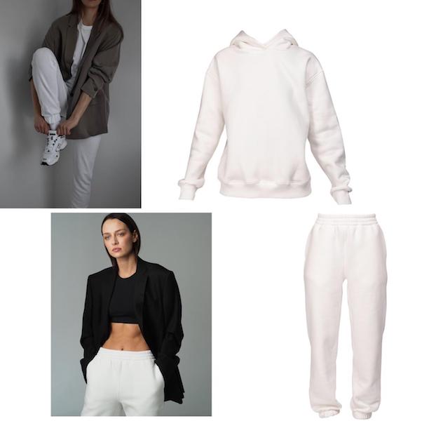 Отличным вариантом может быть топ с джоггерами и сверху объемный блейзер (на фото утепленные худи и спортивные брюки на флисе, цвет ваниль).