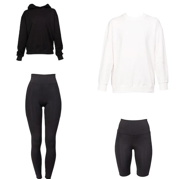 На фото леггинсы Foundation, цвет черный; велосипедки Bike, цвет черный; свитшот Base, цвет ваниль; худи Base утепленный, цвет черный.
