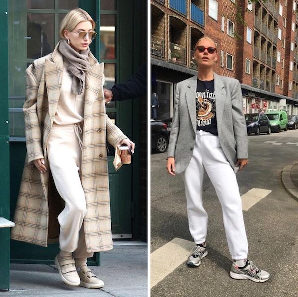 Спортивные костюмы вышли из тени – их носят с куртками, плащами, жакетами, разных цветов и фасонов, но сохраняется общая тенденция на модели оверсайз (на фото утепленные костюмы на флисе, цвета серо-голубой и черный). Кроме очевидных кроссовок можно обуть высокие ботинки.