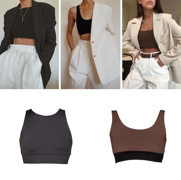 Спортивные топы классно смотрятся с джинсами и брюками на высокой талии. Сверху можно накинуть жакет, рубашку или кардиган. Обувь выбирайте на свой вкус — каблуки или кеды и не забывайте про аксессуары. (На фото топ Daria, цвет черный/мокко; топ Liza, цвет черный).