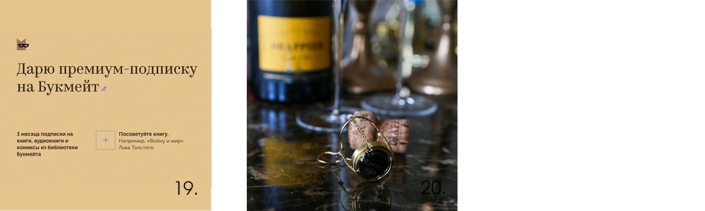 А если уверены, что попадете в самую цель, то дарите премиум-подписку сразу на три месяца на книжный сервис Букмейт (19) и (или) курс «Гастрономический №1», на котором вашего друга научат готовить самый красивый и вкусный праздничный ужин (20).