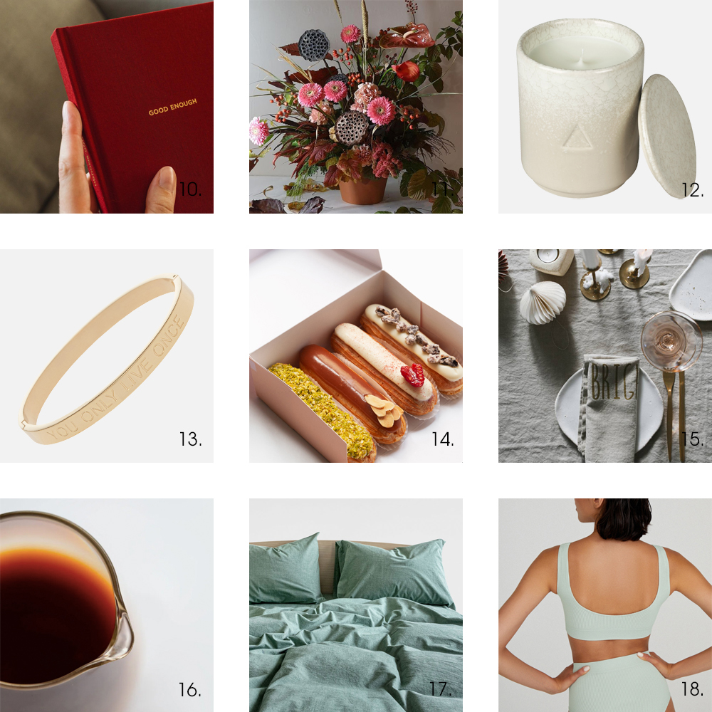 Более персонализированные подарки: дневник для работы над собой Good Enough (10), браслет желания You Only Live Once от Viva La Vika (13), комфортное белье Belle You (18), подписка на кофе на месяц из Bloom-N-Brew (16) и набор эклеров Клер (14).