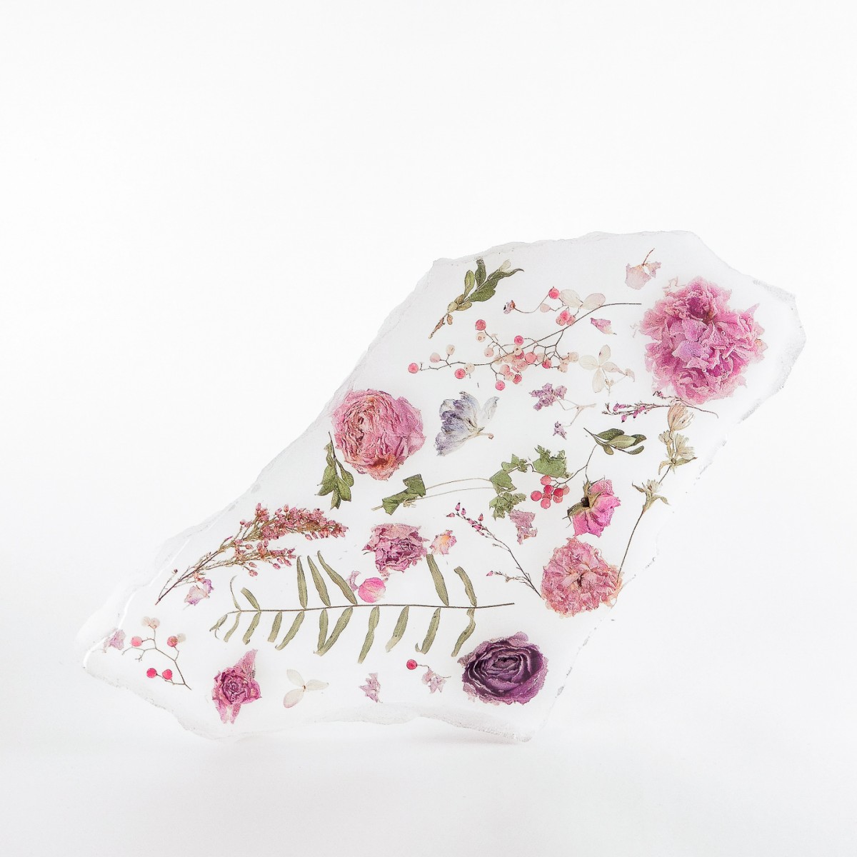 Завораживающий оттенок молочного подчеркивает свежесть растений, которые будто замерли в тумане или замерзли во льду. Украшение для дома сделано Murky.store из эпоксидной смолы, потому требует бережного отношения: его нельзя надолго оставлять на солнце или ставить слишком горячие кружки.