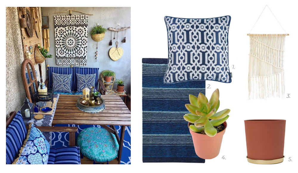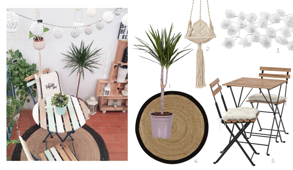 Предметы декора: 1) Драцена, OBI, 2999 руб. 2) Подвесное кашпо H&M Home, 1699 руб. 3) Гирлянда «Ливсор», IKEA, 1299 руб. 4) Ковер Aftas, La Redoute, 6720 руб. 5) Стол и два стула «Тэрно», IKEA, 5497 руб.