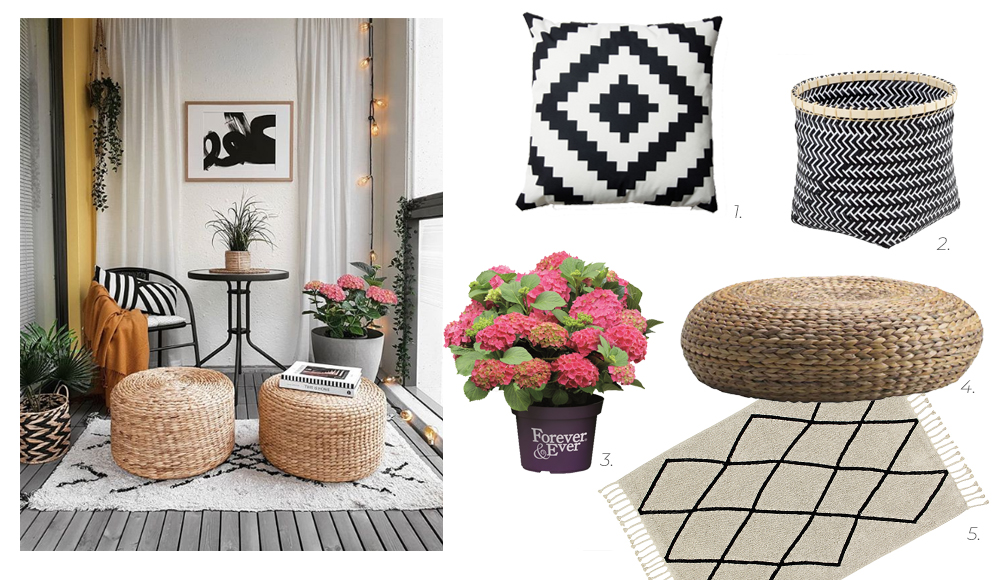 Предметы декора: 1) Чехол для подушки, Barcelona Design, 890 руб. 2) Корзина, DG Home, 1150 руб. 3) Гортензия крупнолистная, Martin Sad, 5000 руб. 4) Пуф-табурет «Альседа», IKEA, 2799 руб. 5) Ковер Bereber, DG Home, 18400 руб