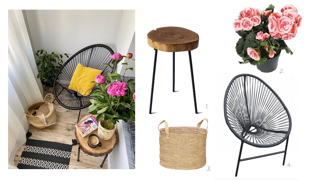 Предметы декора: 1) Стол со столешницей из дуба, TheSarai, 4270 руб. 2) Бегония Элатиор, OBI, 369 руб. 3) Корзина с ручками, Furnish, 22 890 руб. (за 2 шт.) 4) Стул Acapulco, «Первый гипермаркет мебели», 4200 руб.