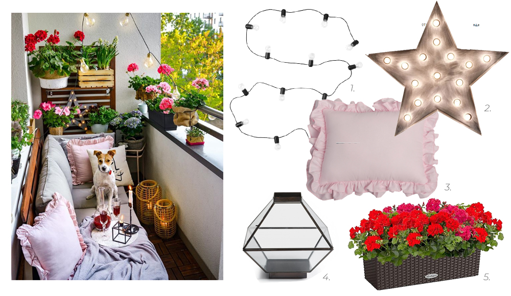 Предметы декора: 1) Гирлянда «Свартро», IKEA, 2799 руб. 2) Настенный светильник «Звезда», DG Home, 49 500 руб. 3) Подушка с рюшами, OZON, 1170 руб. 4) Подсвечник La Forma, Dg Home, 11 990 руб. 5) Герань в Lechuza Balconera Cottage, Luxury Plants, 7950 руб.