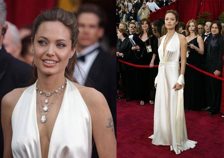 Именно этот выход превратил «Лару Крофт» в принцессу. После мероприятия СМИ признал актрису иконой стиля – с этой регалией Анджелина не собирается прощаться до сих пор. Для красной ковровой дорожки она выбрала жемчужное платье Marc Bouwer. Дополнили образ массивное колье, высокая укладка на полураспущенные волосы и нюдовый макияж.